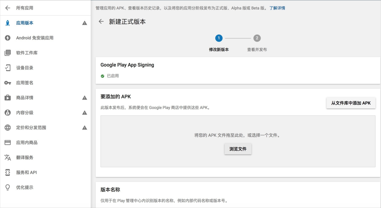 应用版本页面有3块内容,分为正式版、Beta版、Alpha版本。正式的App建议在内测阶段先上传Alpha和Beta版本,因为Google可以提供免费的云测。这里我们直接点击管理正式版本: