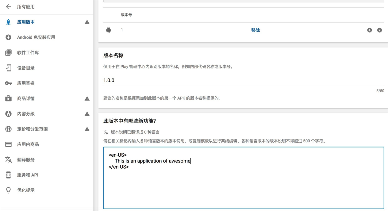 上传完毕后,版本号和版本名称就自动录入到填写内容中了,然后你需要填写的是“此版本中有哪些新功能”,这也没什么可说的,现在就可以去填写内容分级了。点击左边导航栏的“内容分级”,接着点击继续。