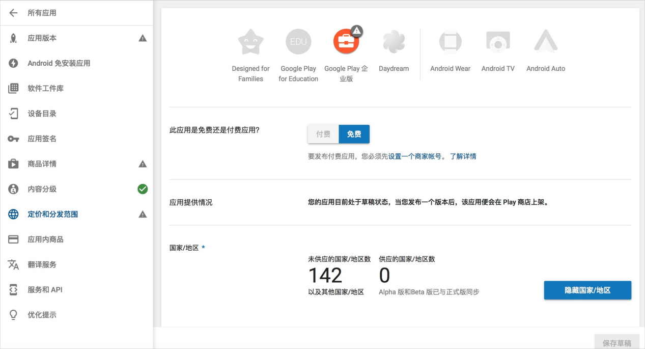 到现在为止我们就还差最后一个“定价和分发范围”了,还是在左边导航栏选择“定价和分发范围”: