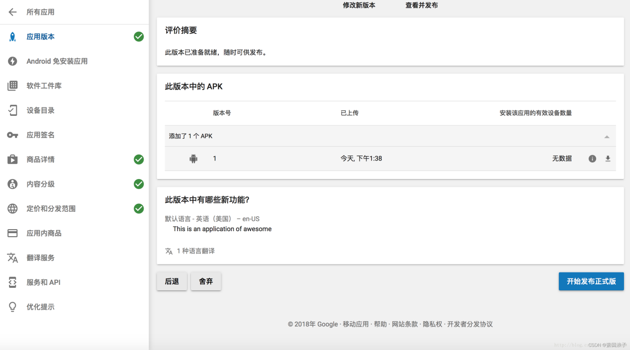 到此为止你只要再点击开始发布正式版,就可以发布了~再之后就是等待的过程了,一般1个小时左右可以通过审核。